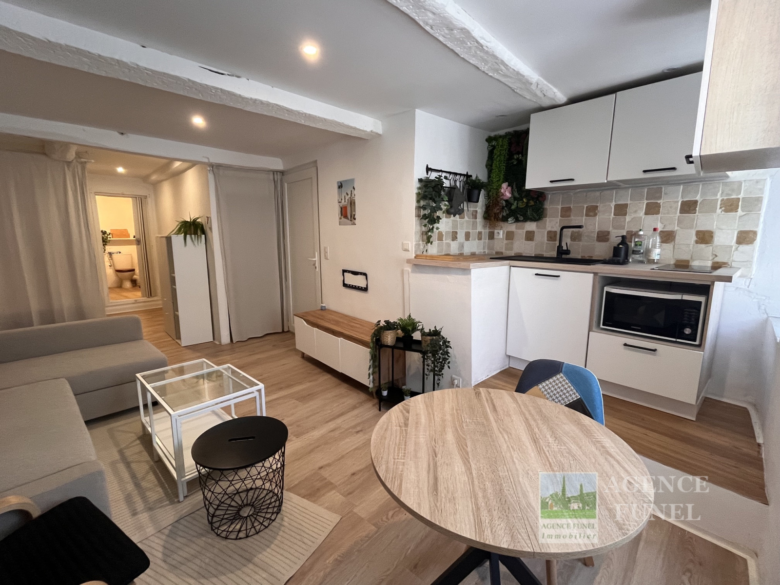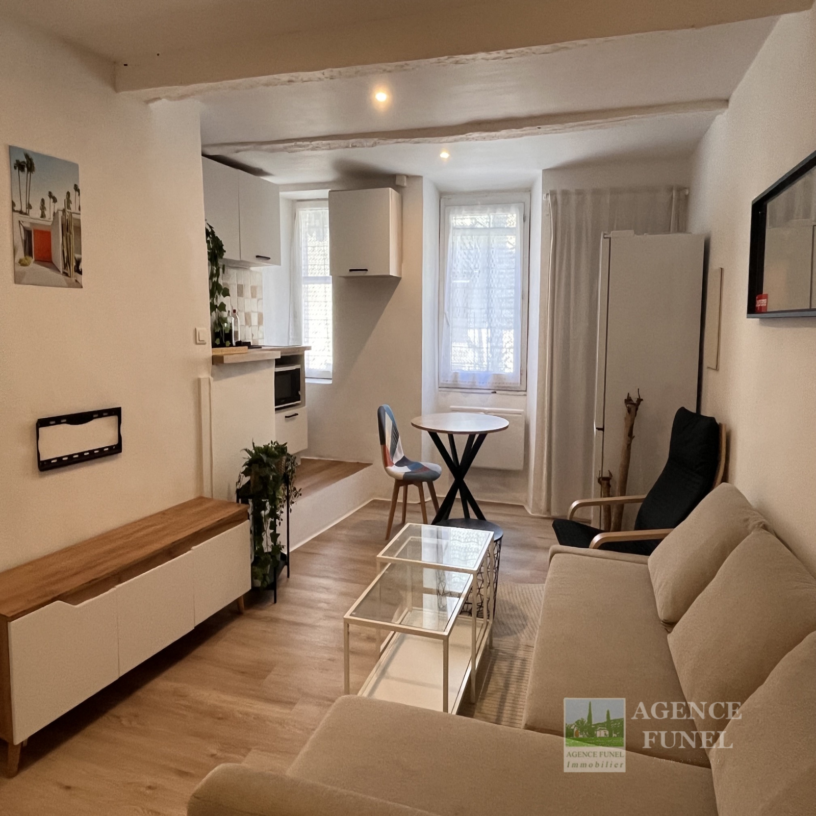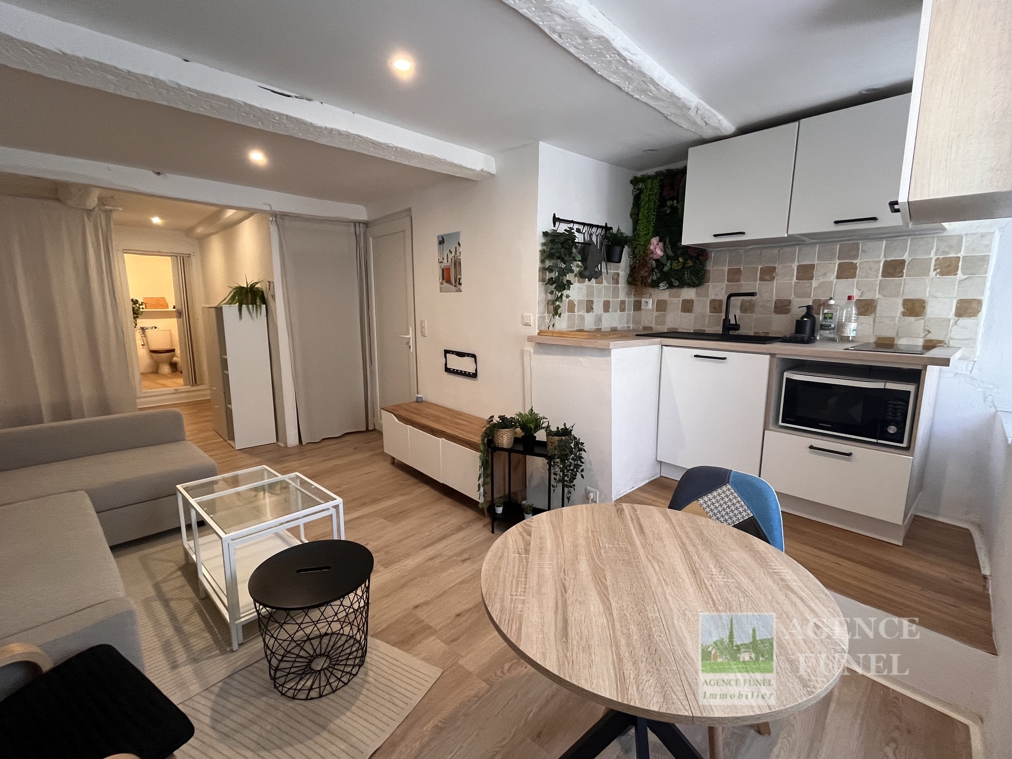 Au Coeur du village, Très bel appartement de Type T1, meublé, se composant de : Entrée sur Salon avec Cuisine américaine équipée, 1 coin nuit, 1 Wc avec rangements et buanderie, 1 Salle d'eau.