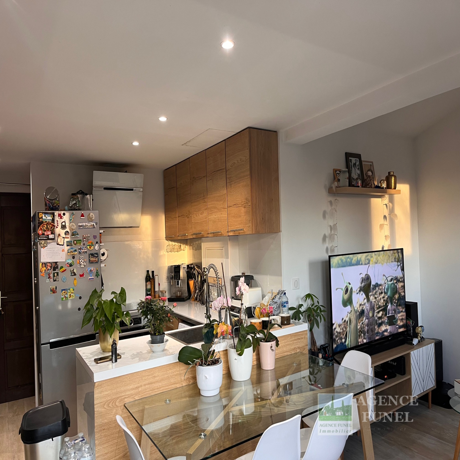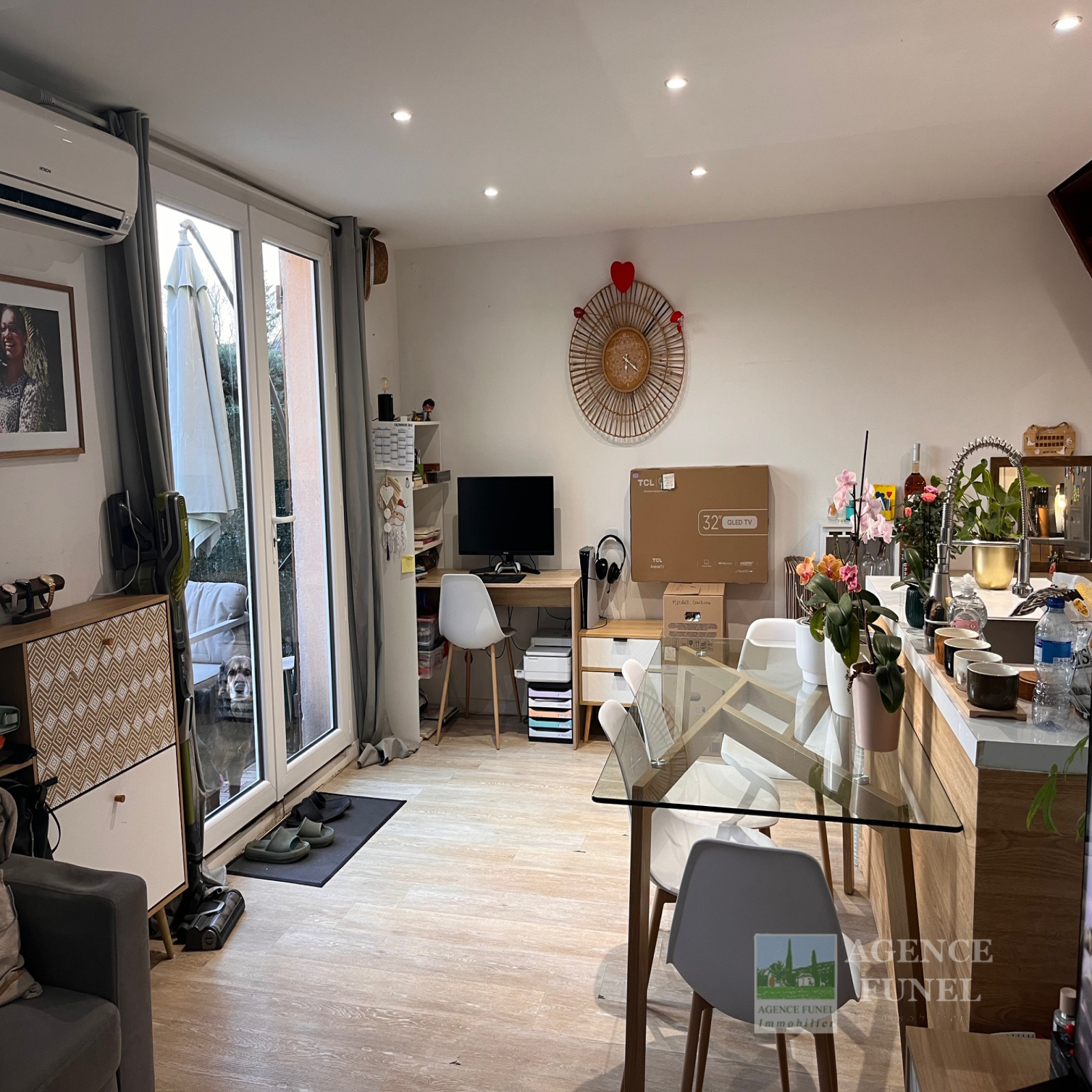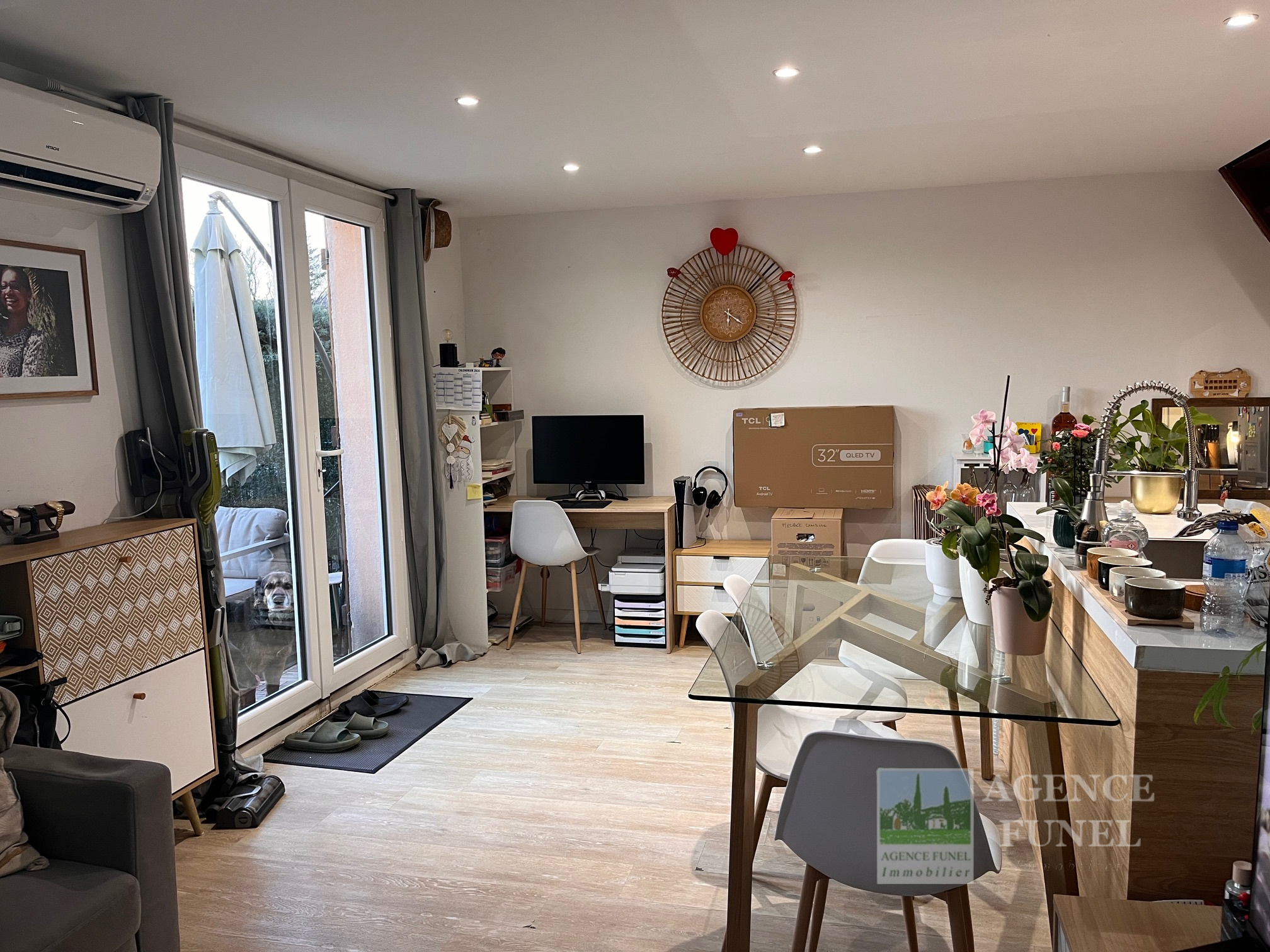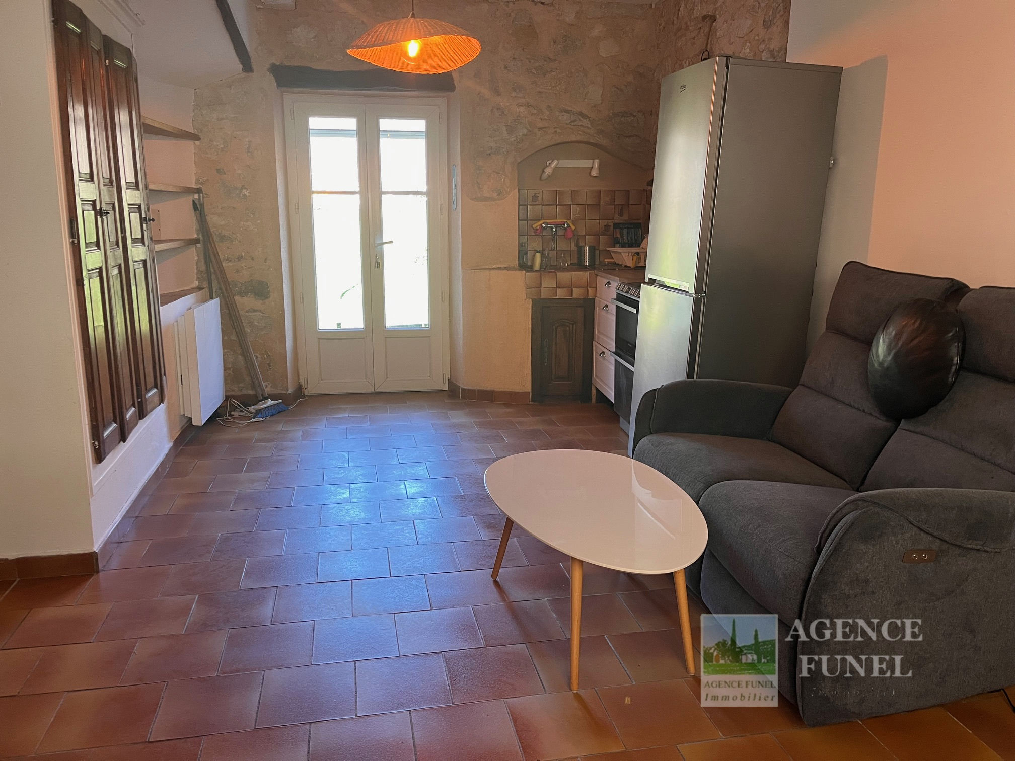RDC : Entrée, Salon, Cuisine américaine équipée, Wc indépendant.