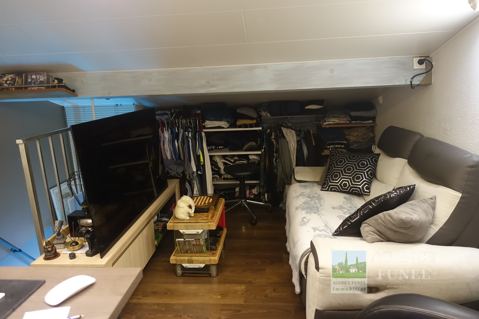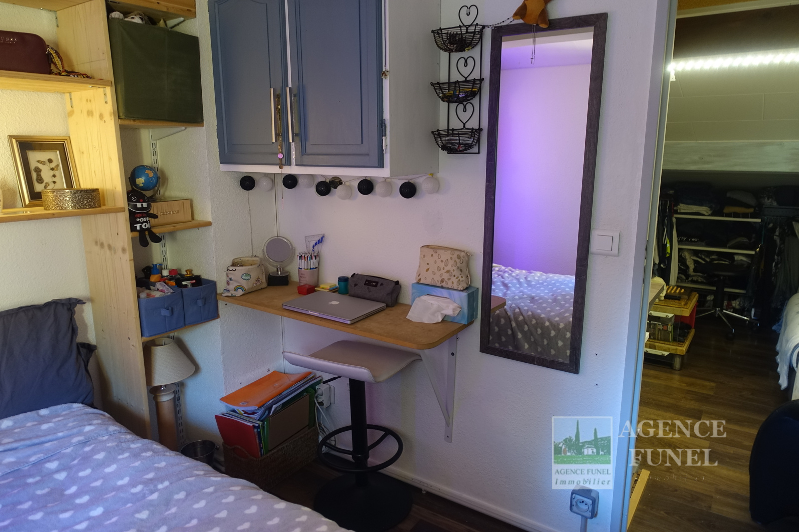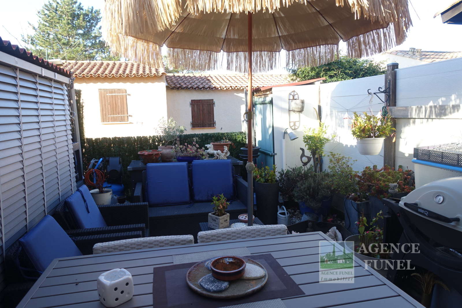 Dans Résidence avec Piscine et Tennis, Très Jolie Maisonnette jumelée se composant de : Entrée, grands placards de rangements, Pièce de vie avec cuisine Américaine aménagée ouvrant sur une Terrasse par baie vitrée en galandage, Salle d'eau avec Wc. A l'étage : 1 Mezzanine, 1 Chambre avec Wc.