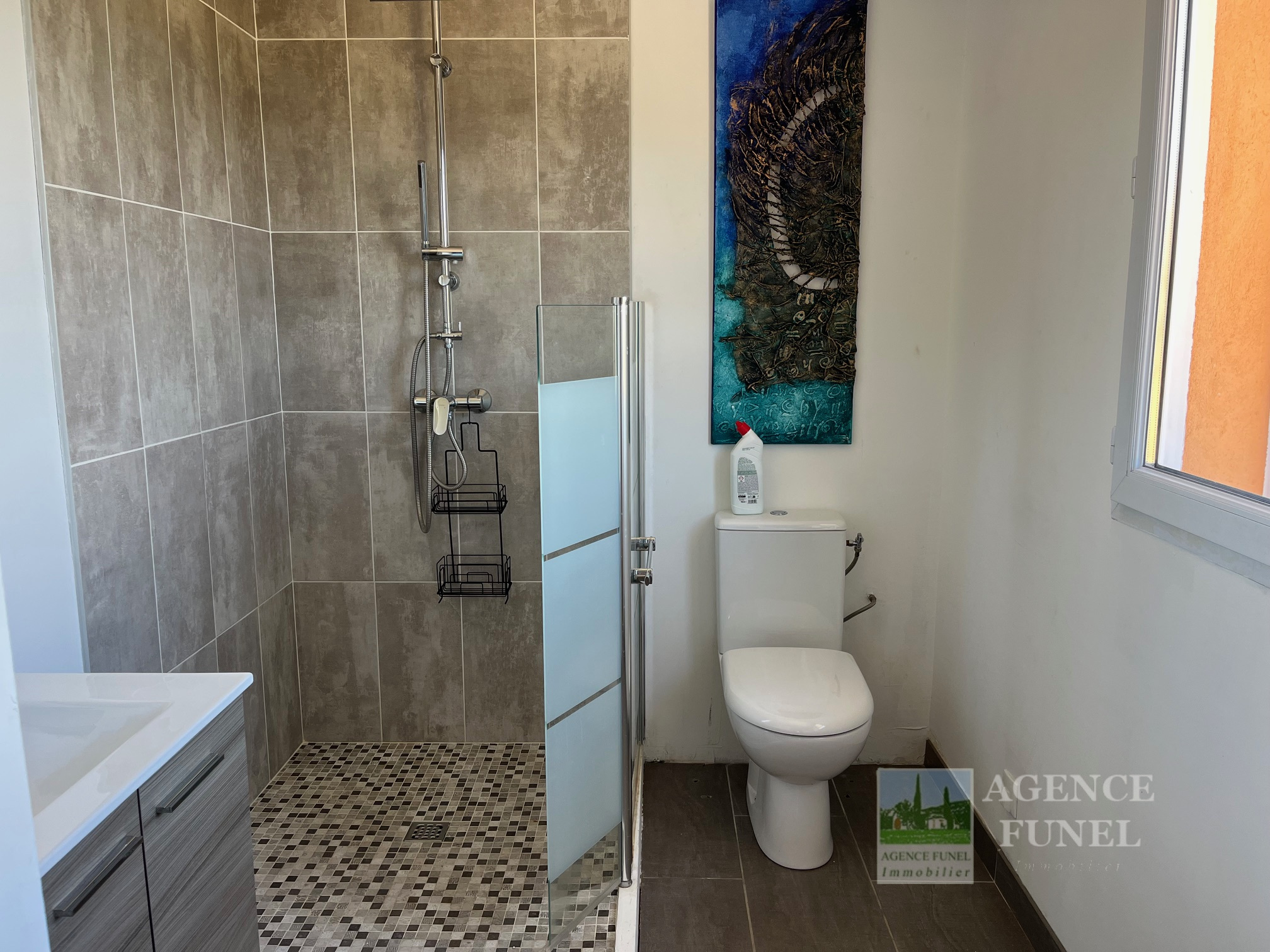 RDJ : Salon cathédrale ouvrant sur la piscine et terrasses par une large baie vitrée, Cuisine ouverte équipée, dégagement avec rangements, 2 Chambres avec placards, 1 Salle de bains avec baignoire et douche, Wc indépendant, 1 cellier-buanderie.