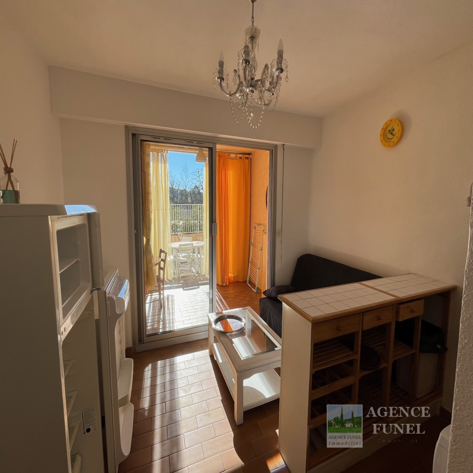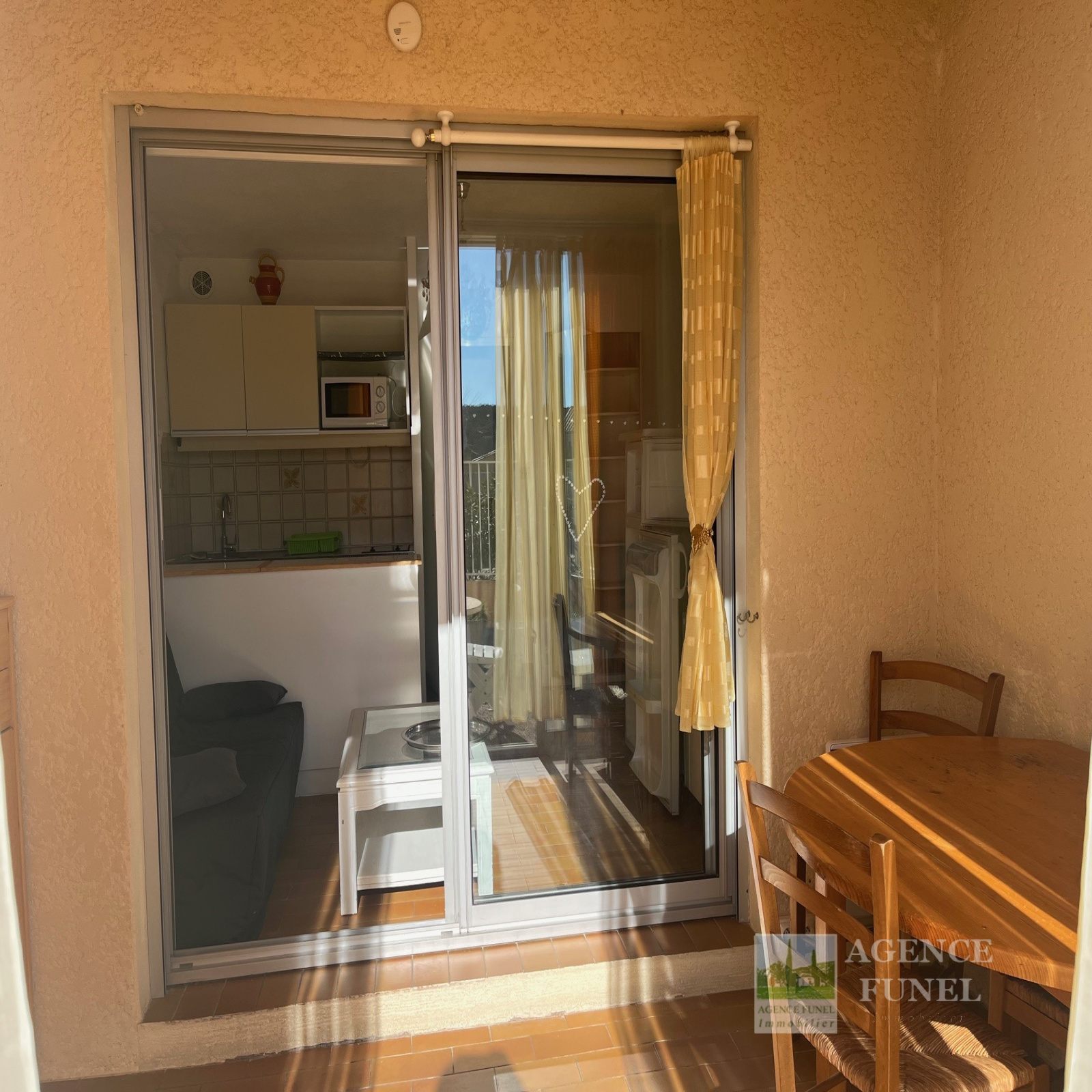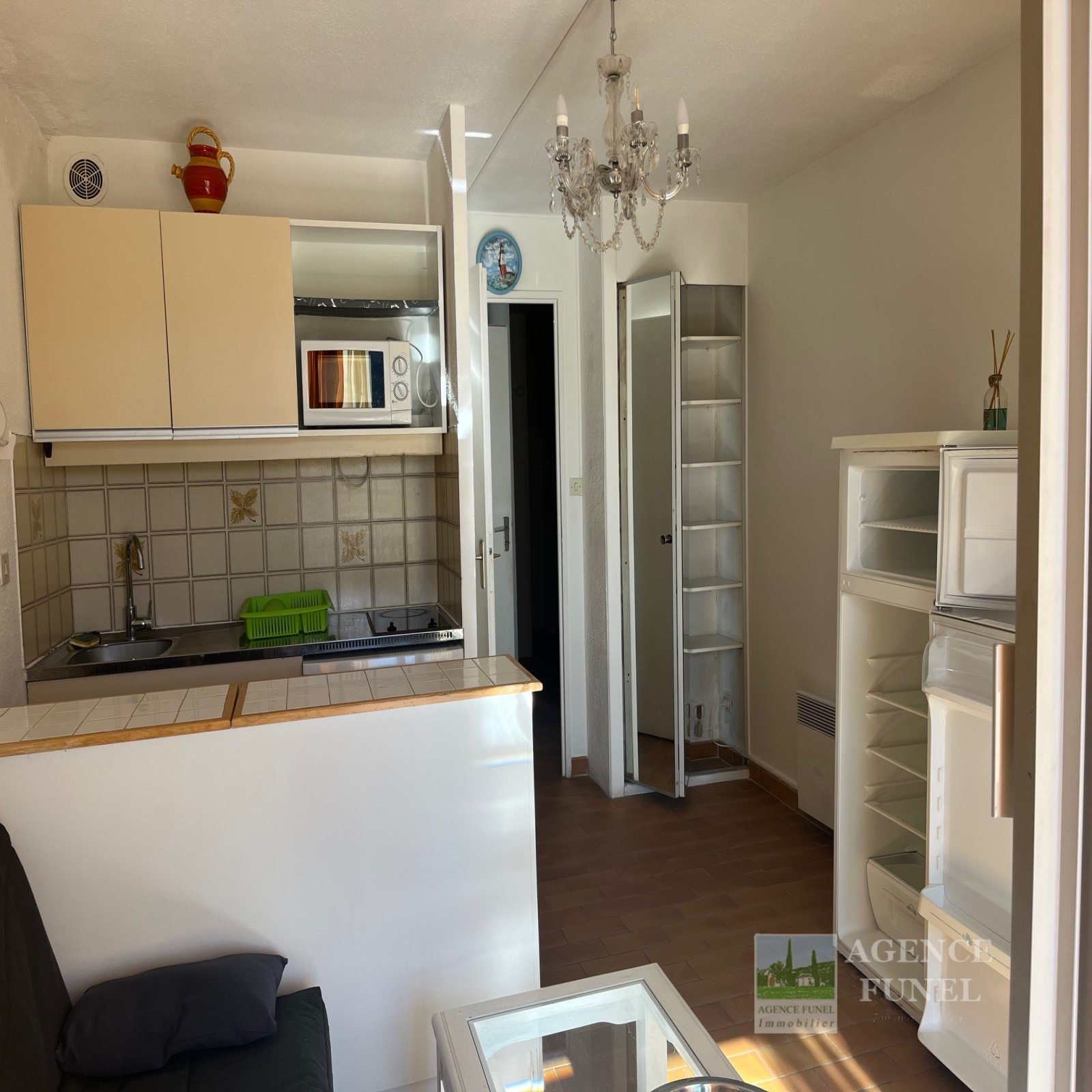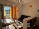 Entrée, placards, Pièce de vie avec coin cuisine, loggia fermée, 1 cabine avec coin nuit et placard, Salle d'eau avec Wc.