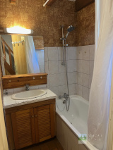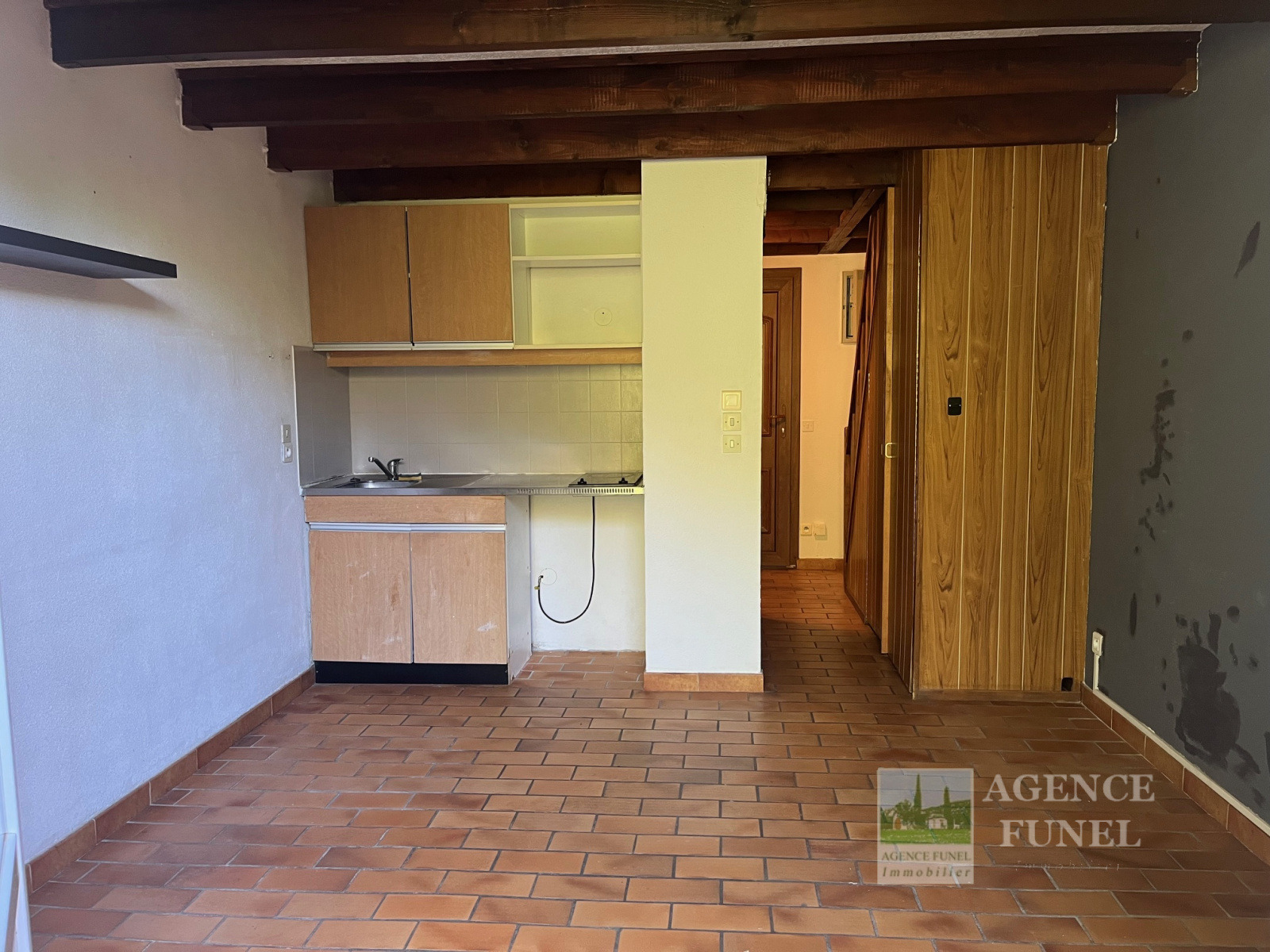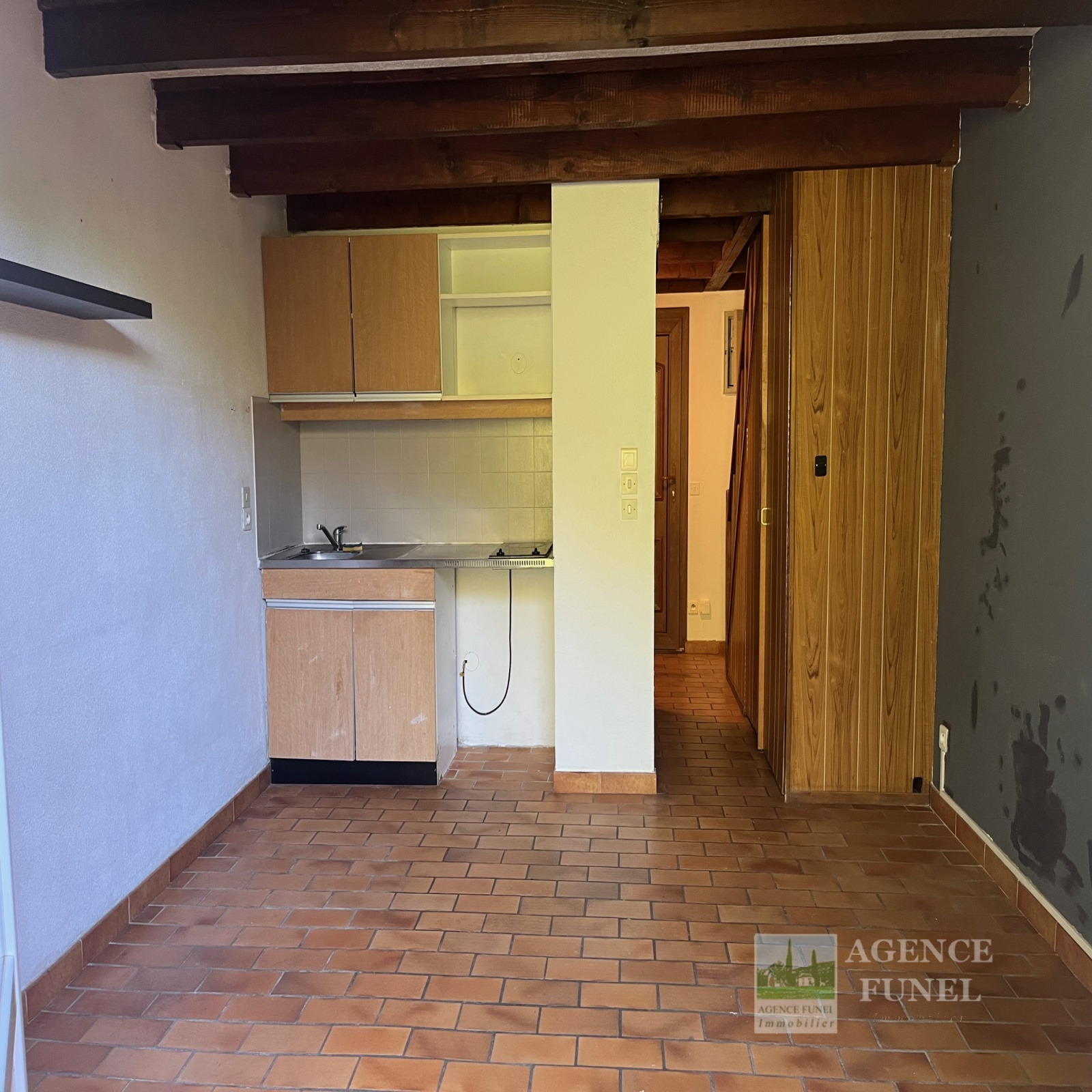 RDC : Entrée avec placards, Pièce de vie avec coin cuisine ouvrant sur Terrasse et dégagement, Salle de bains avec Wc.