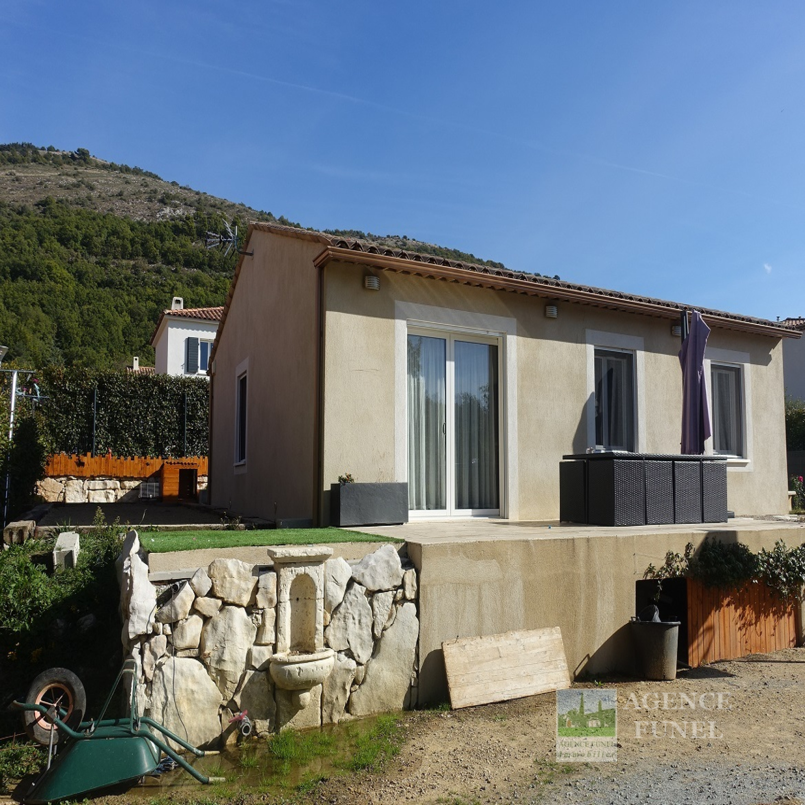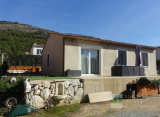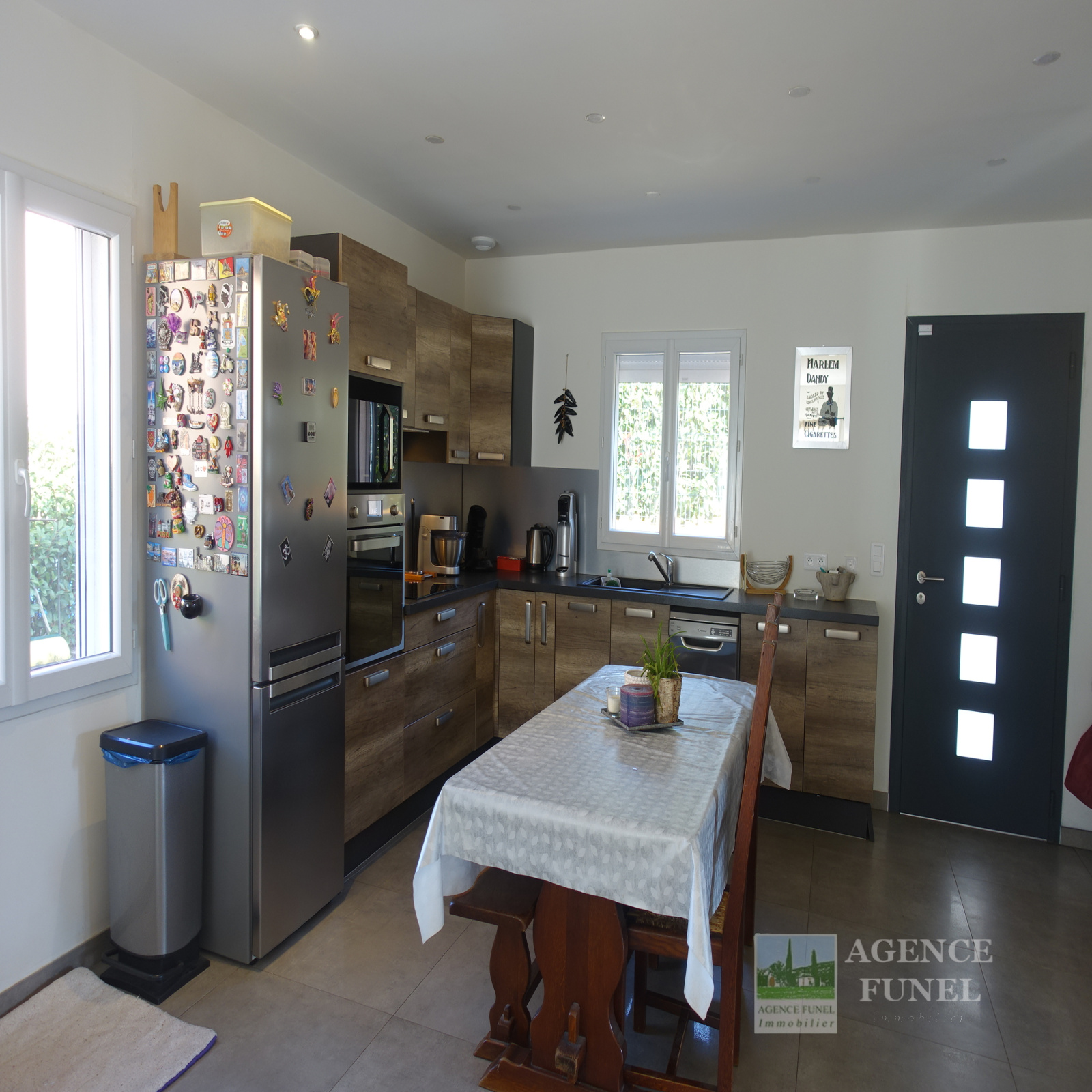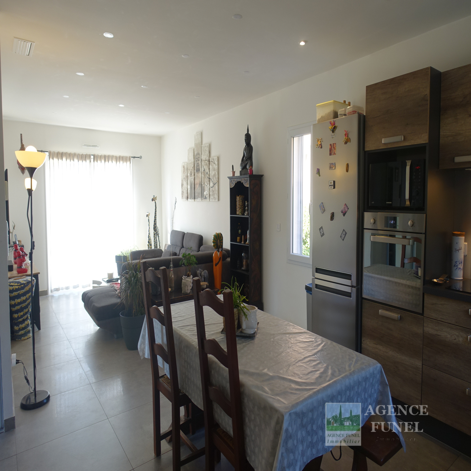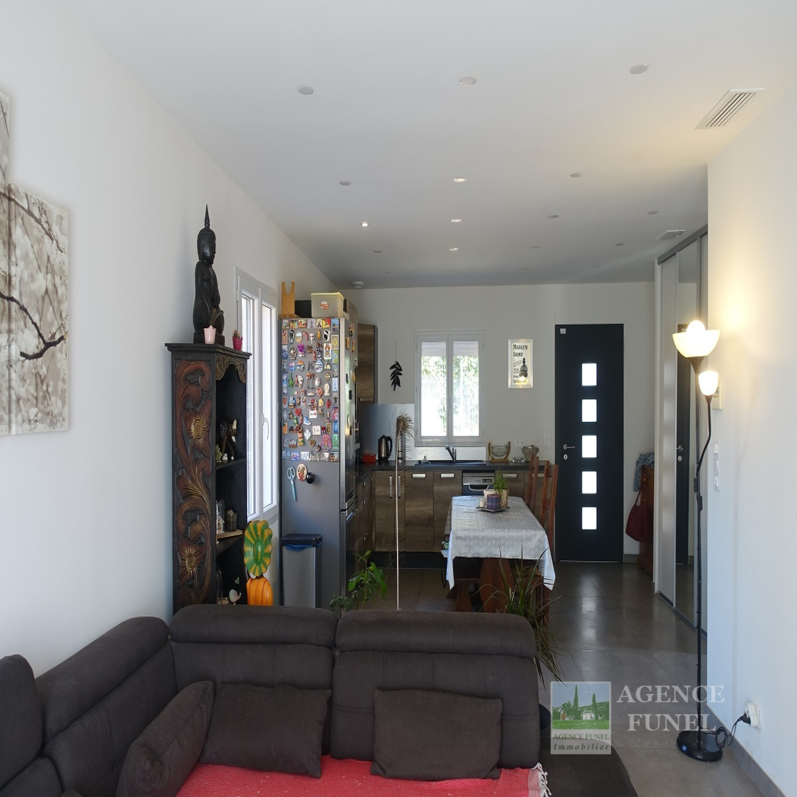 Proche Village, Très Jolie Villa Individuelle de Plain-pied, fonctionnelle, construite en 2017, se composant de : Entrée sur Salon avec Cuisine américaine aménagée, dégagement, 3 Chambres avec Placards, Salle d'eau, Wc.