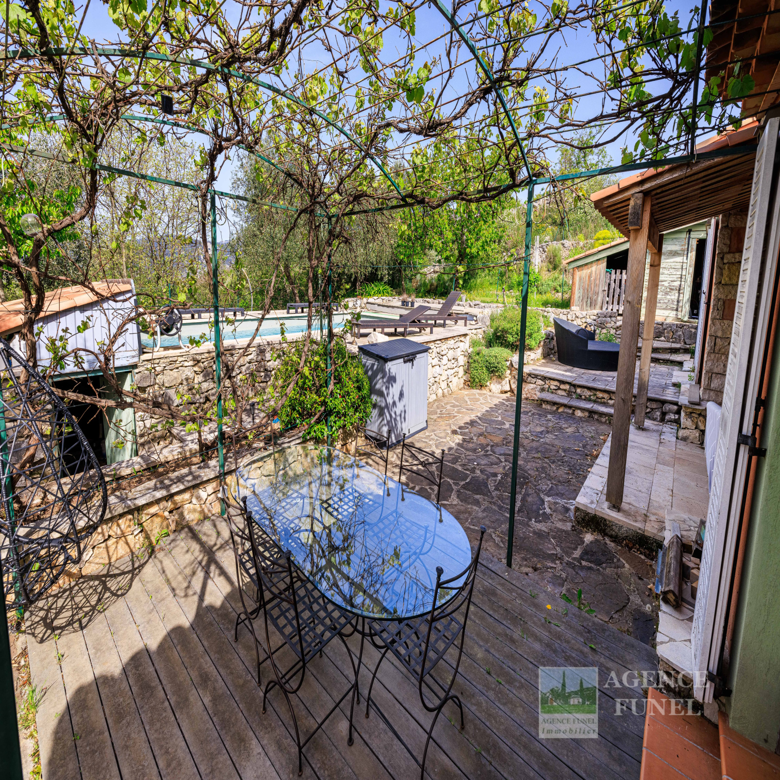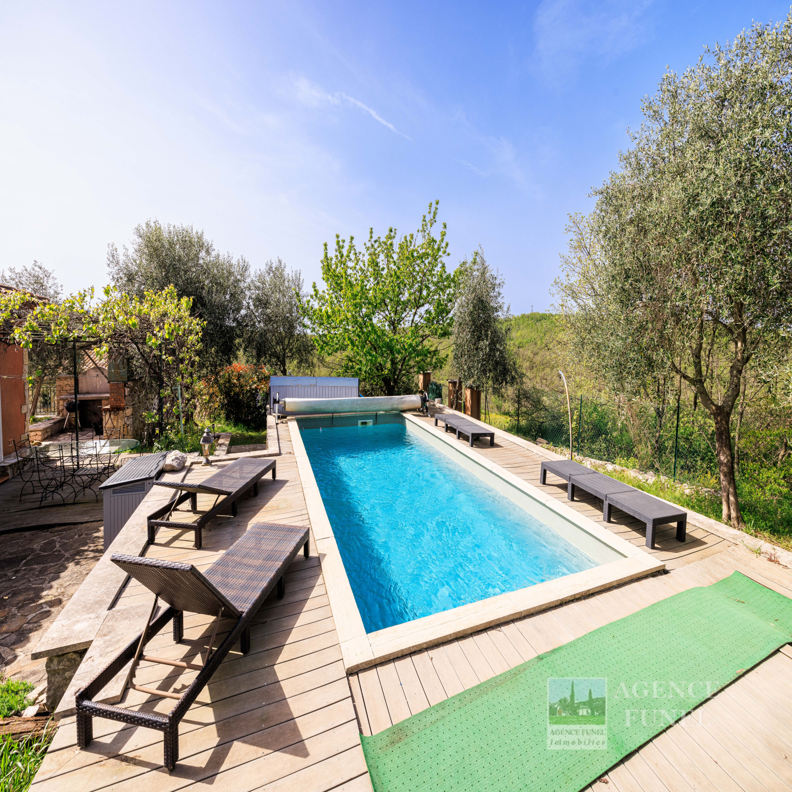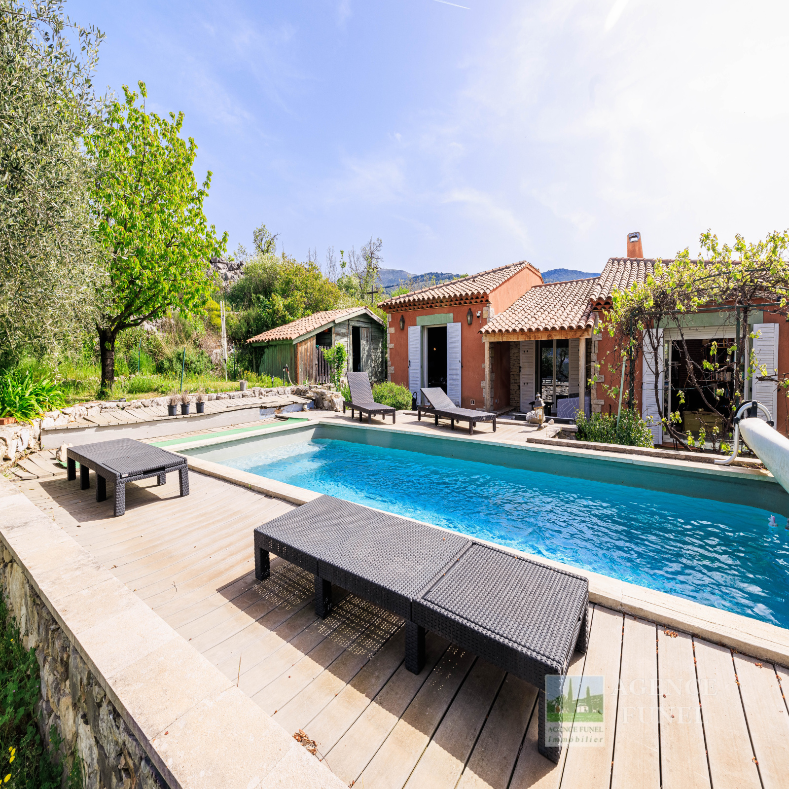 Terrain de 1.000 m² environ avec belle piscine et vastes terrasses extérieures.