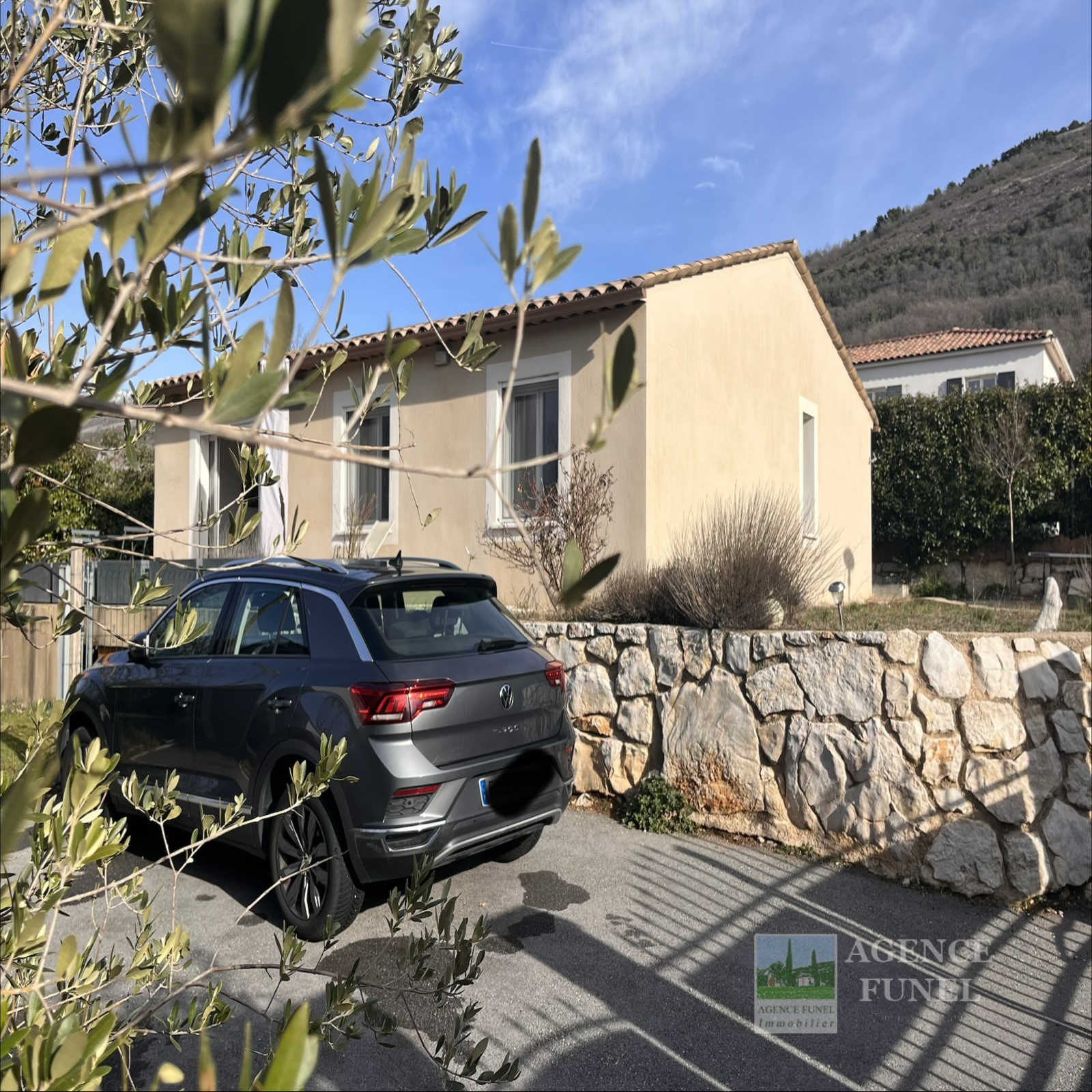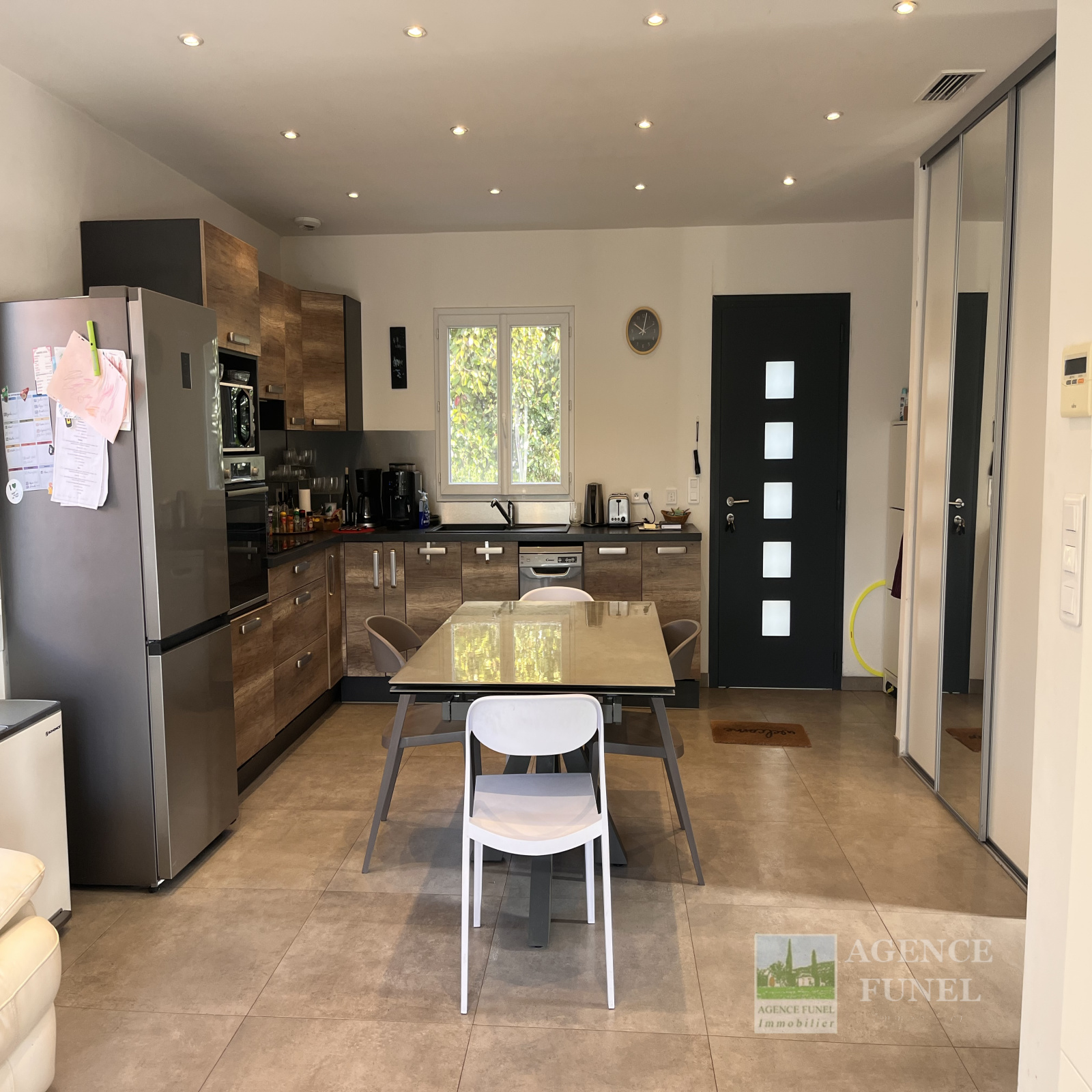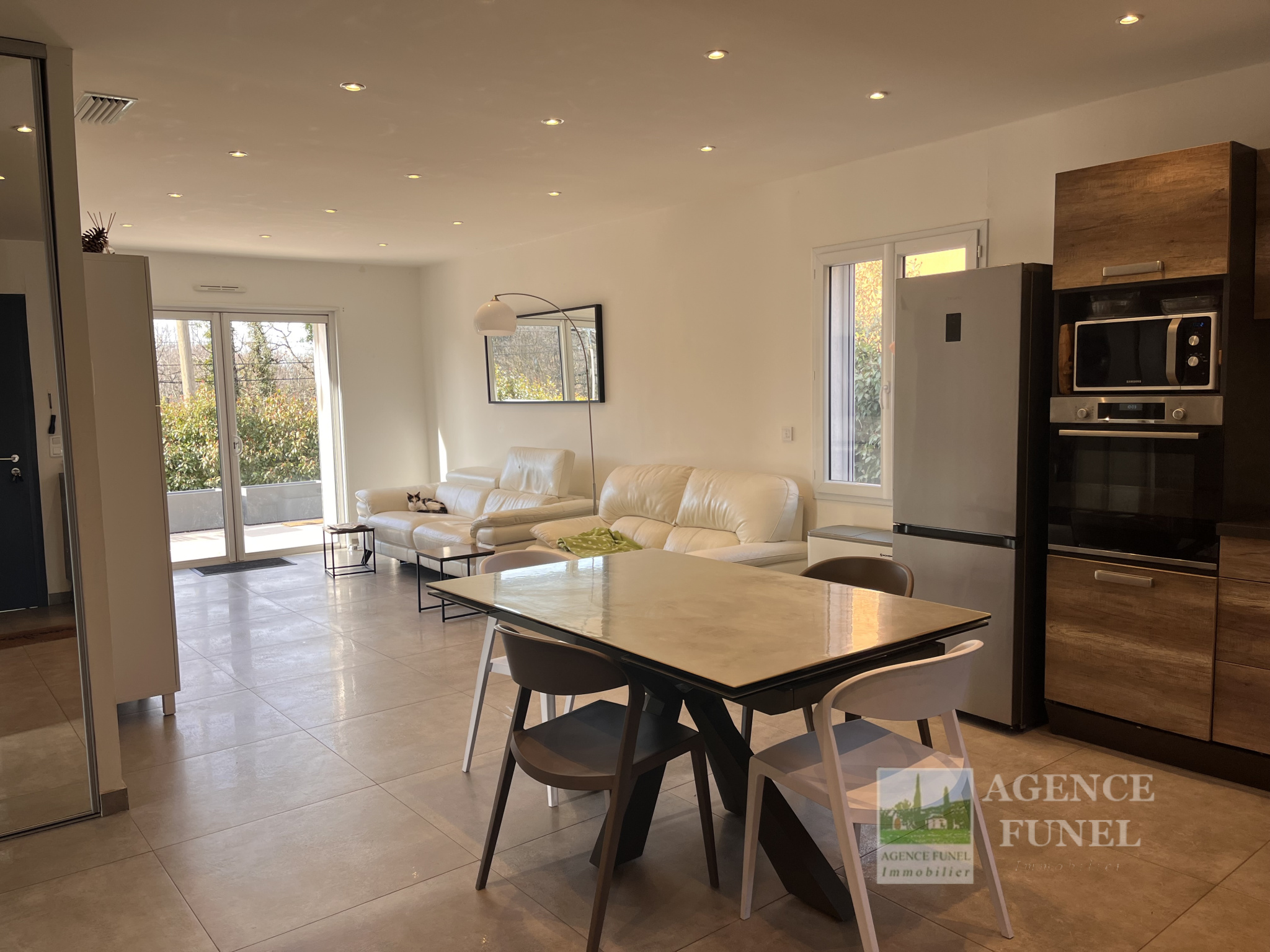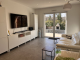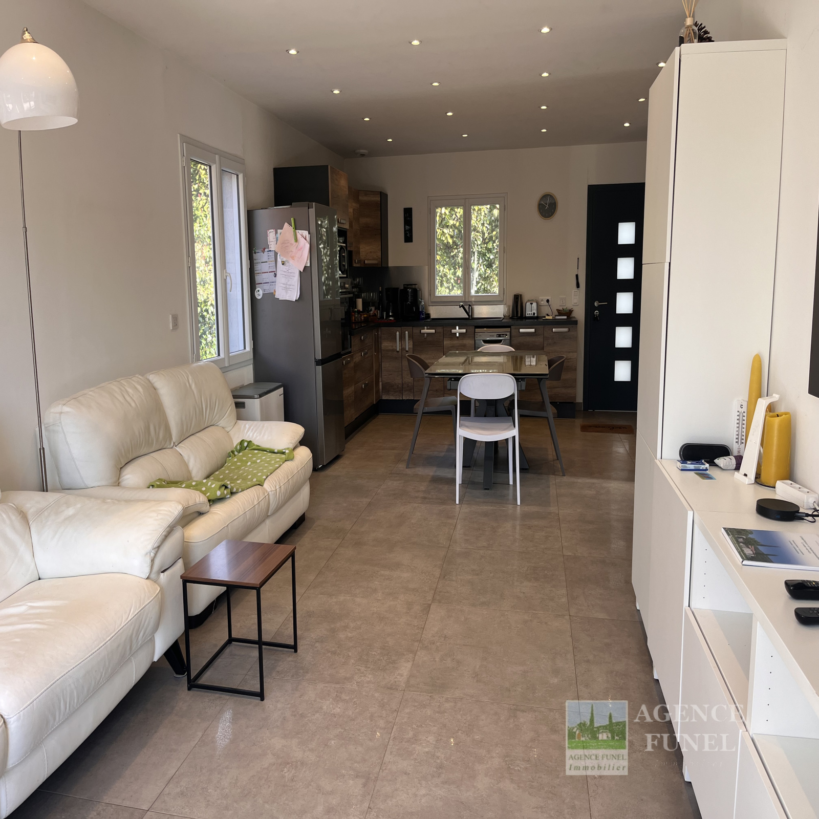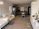 Proche Village, Très Jolie Villa Individuelle de Plain-pied, très fonctionnelle, nombreux rangements, construite en 2017, se composant de : Entrée sur Salon avec Cuisine américaine aménagée ouvrant sur une Terrasse par une baie vitrée en galandage, dégagement - placards, 3 Chambres avec Placards, Salle d'eau, Wc.