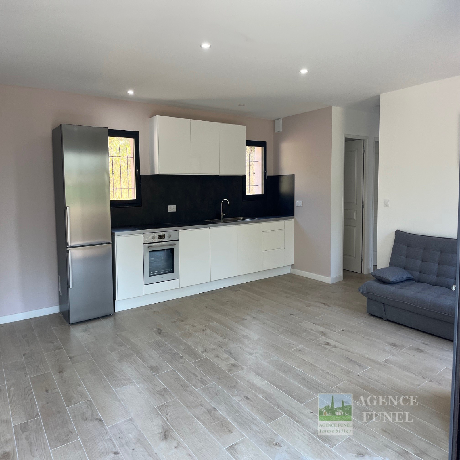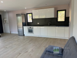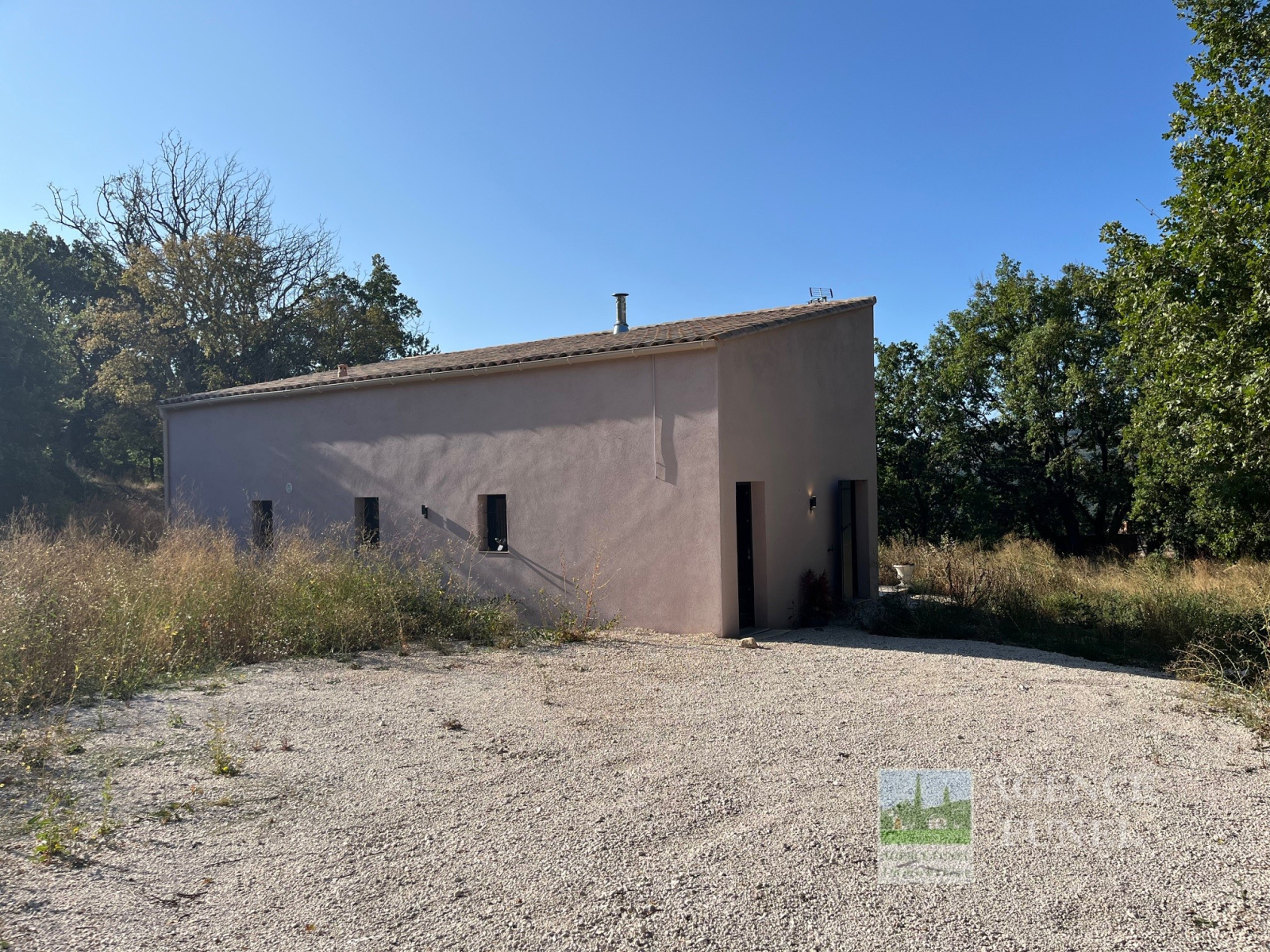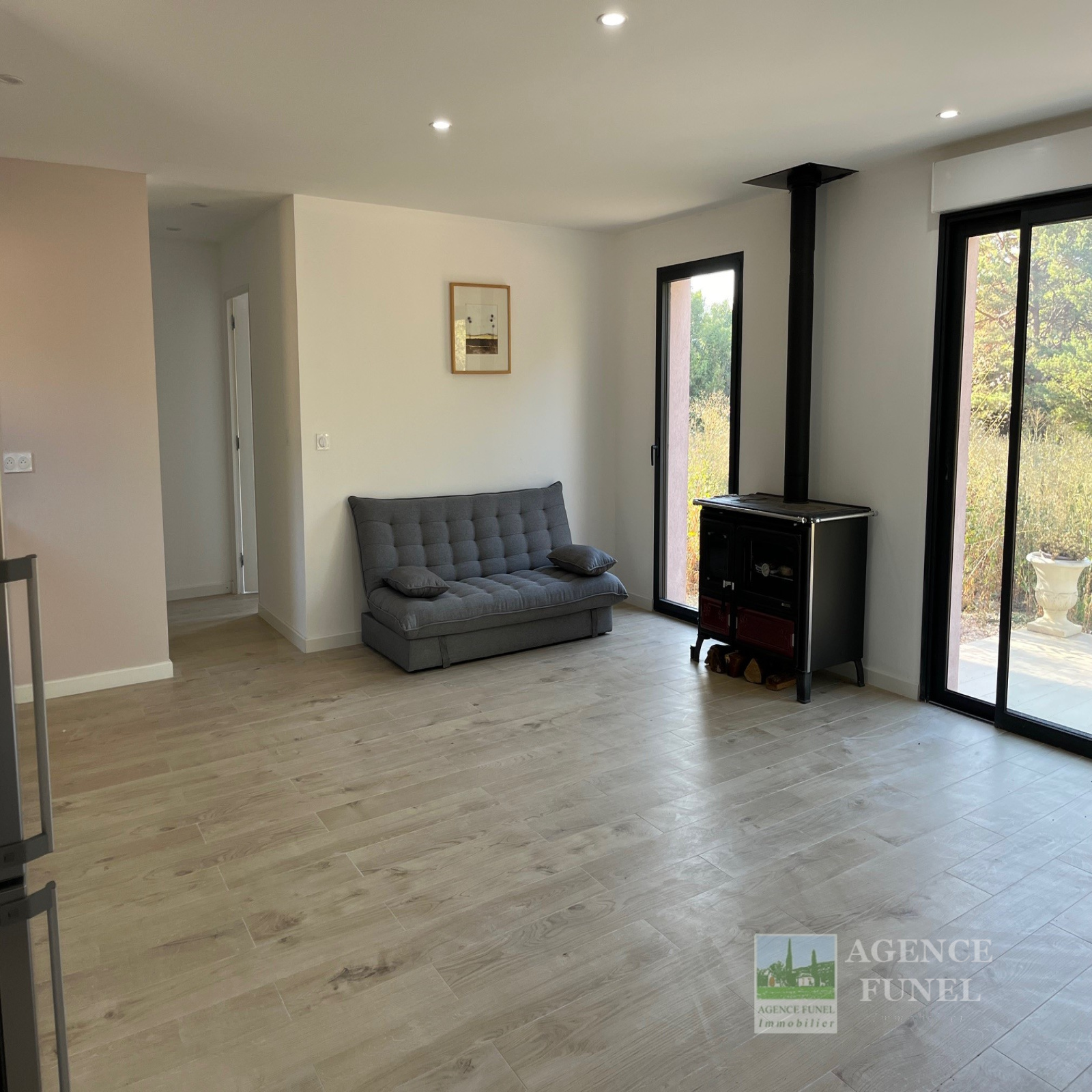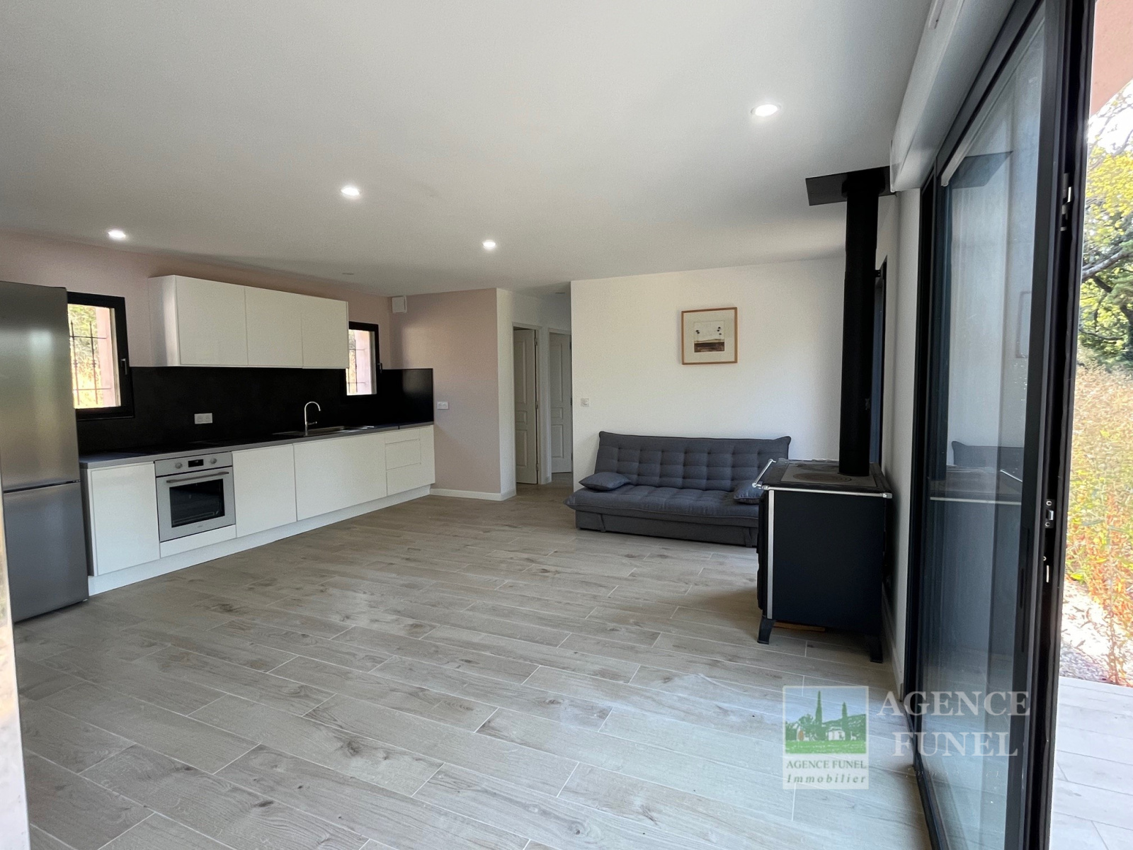 RDC : Entrée sur living avec Poêle à bois ouvrant sur le jardin (baie vitrée), Cuisine américaine équipée, Wc, Cellier, 1 Chambre avec salle d'eau.