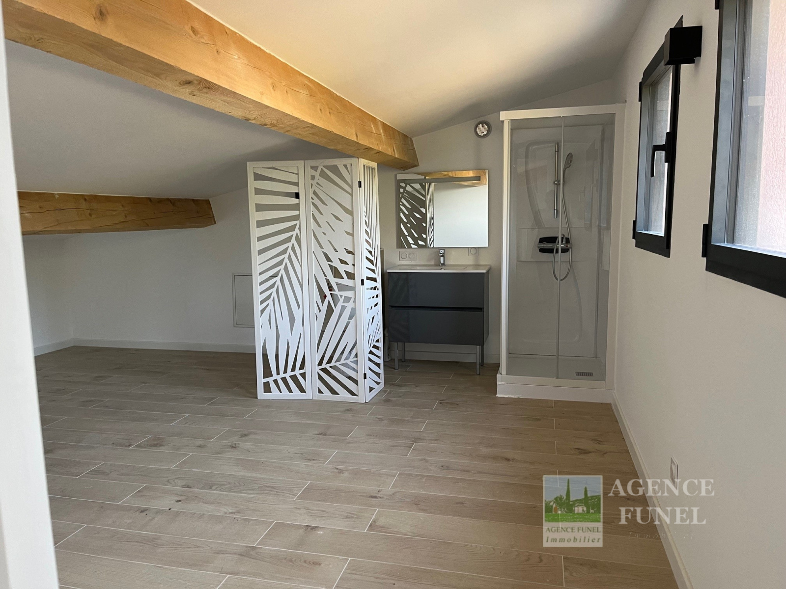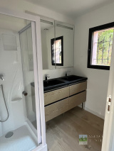 A l'étage : 2 vastes chambres mansardées dont une avec douche et Wc.