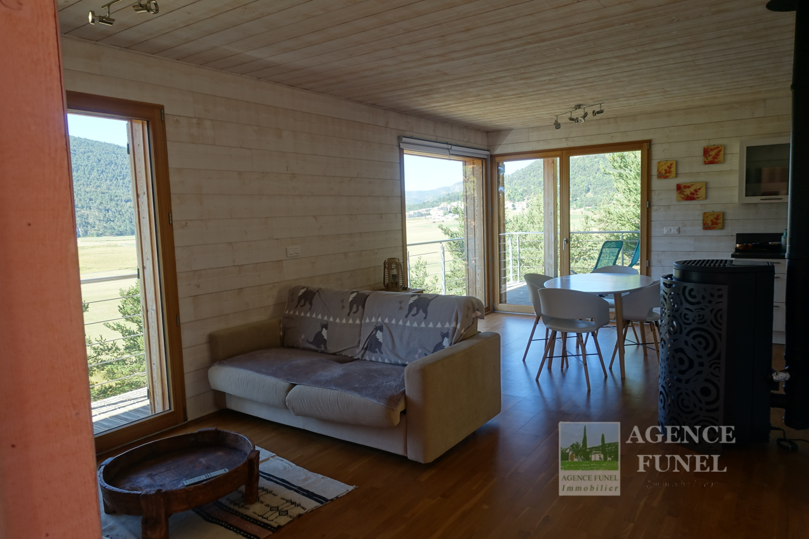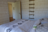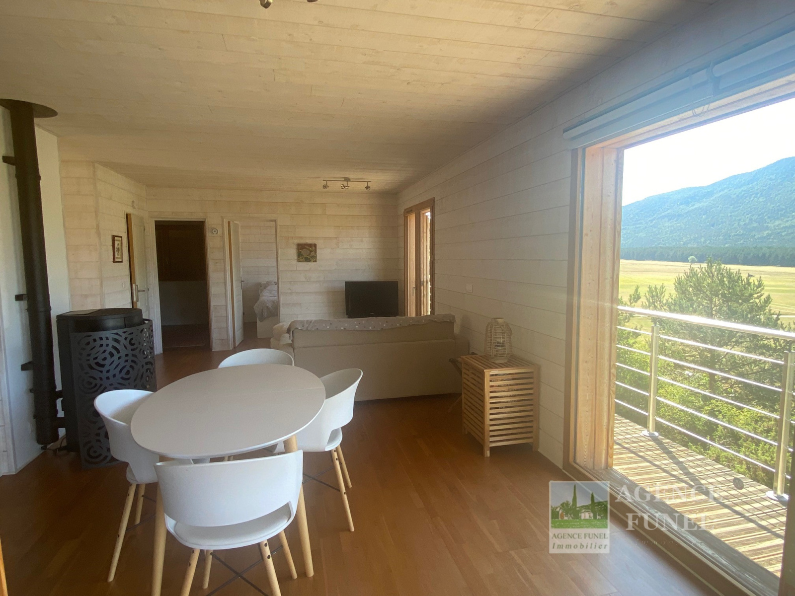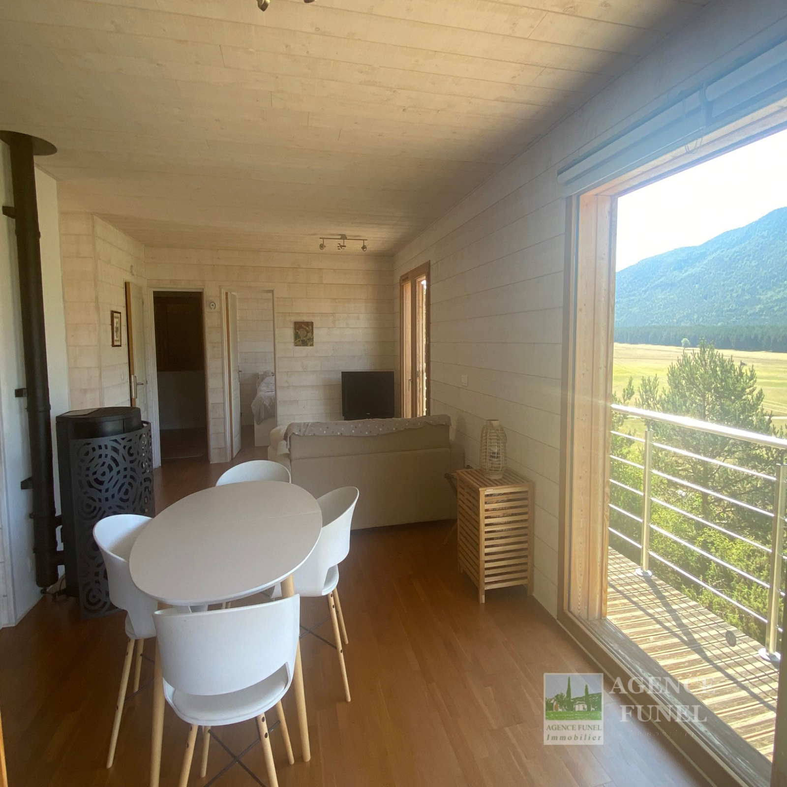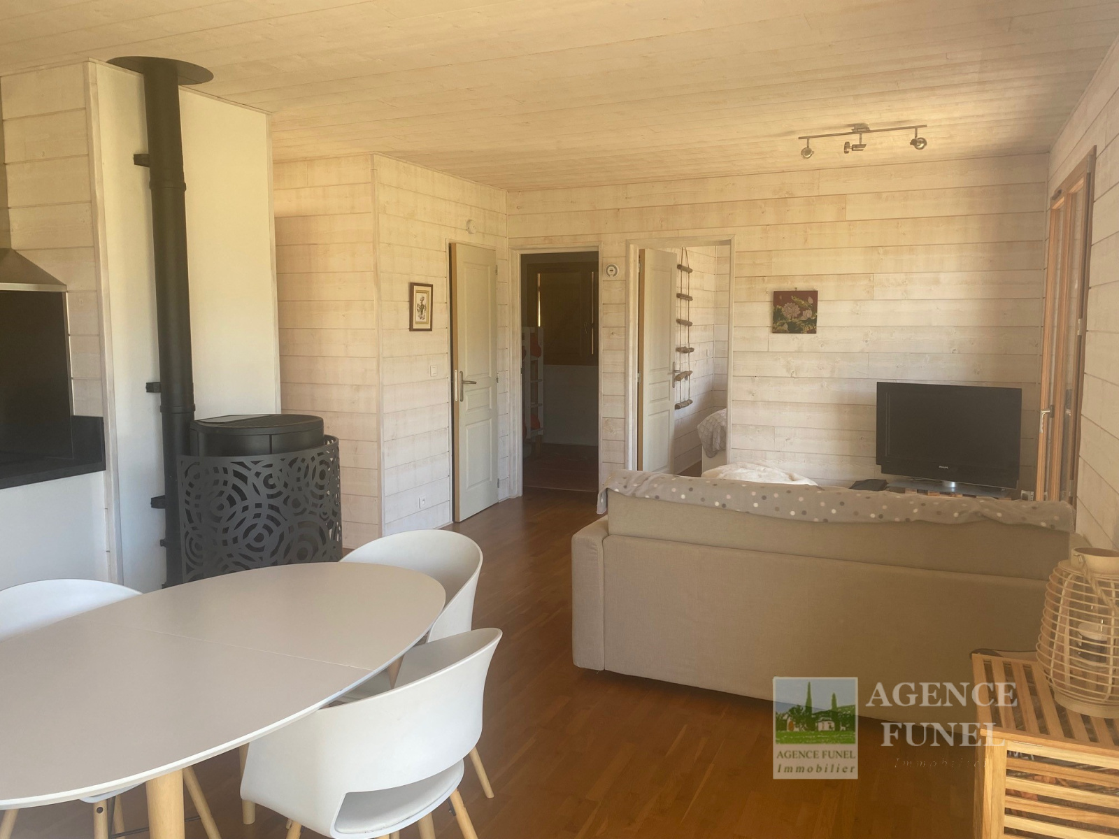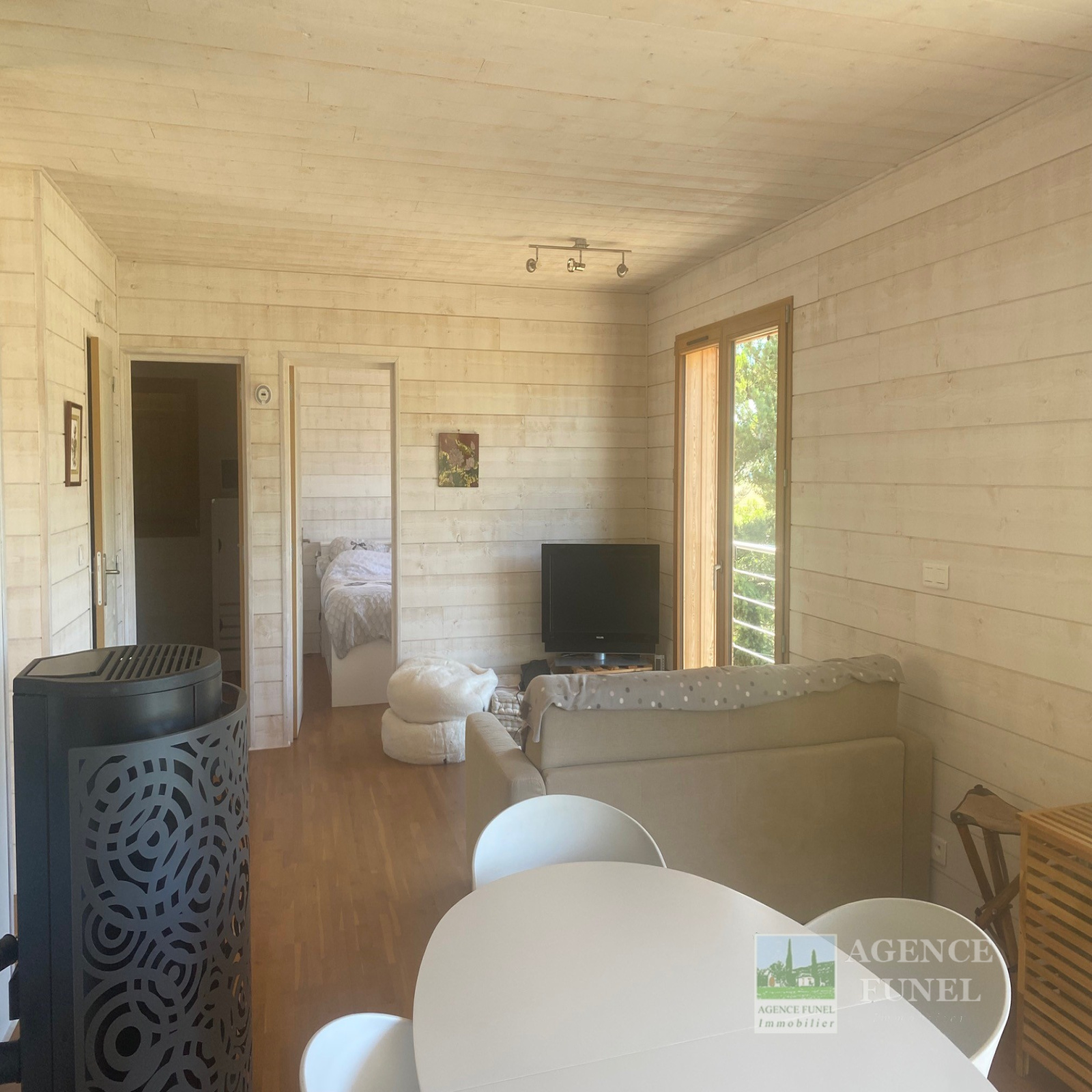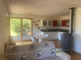 Il se compose d'une entrée avec placards, Salon avec Poêle à bois ouvrant sur Terrasse, Cuisine américaine équipée, 2 Chambres, Salle d'eau avec Wc.
