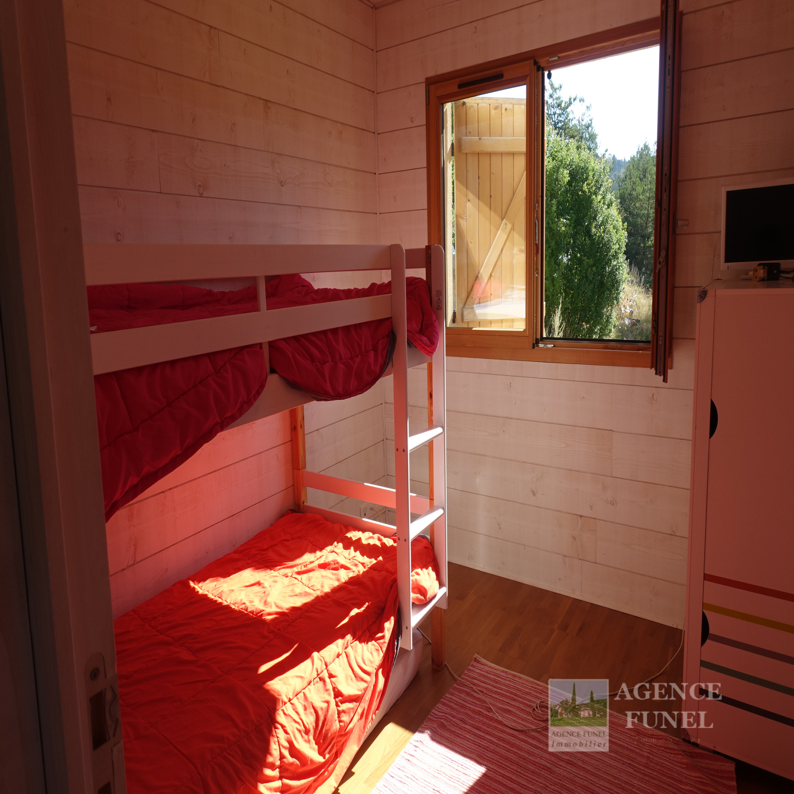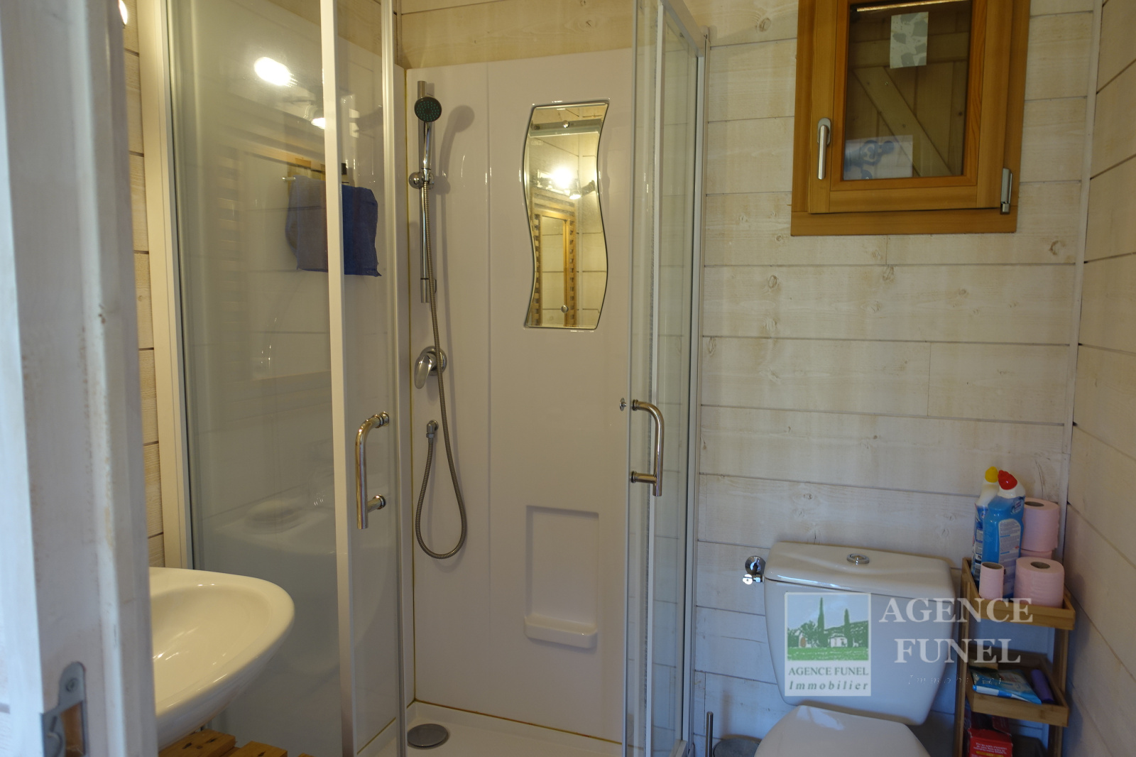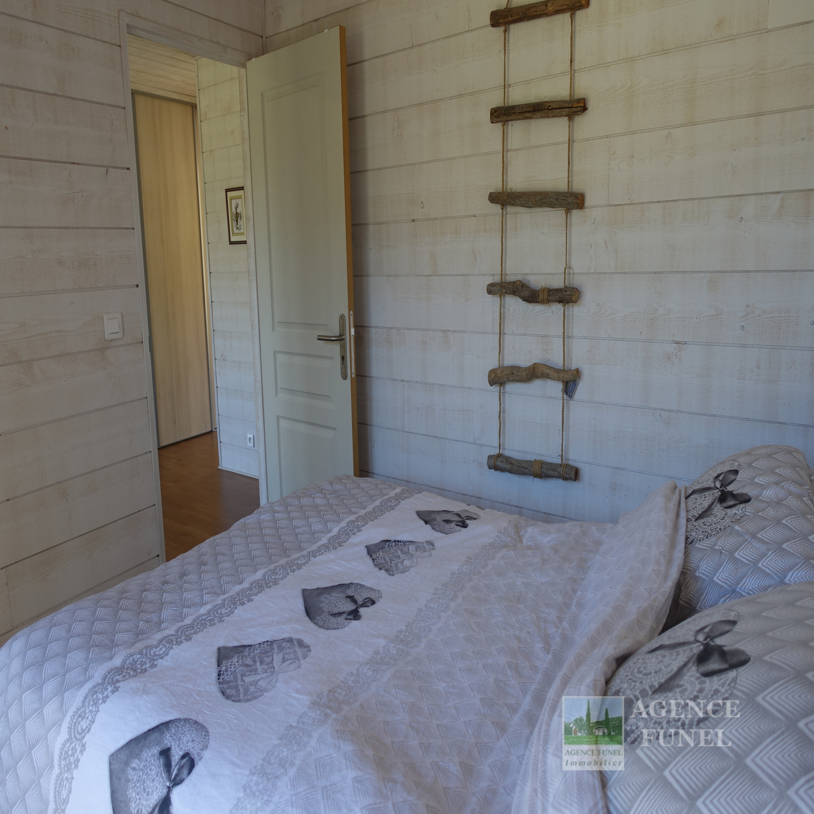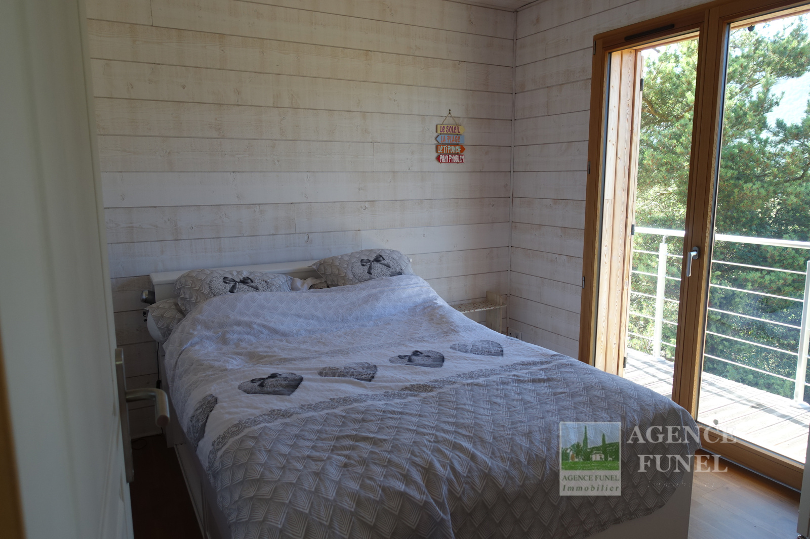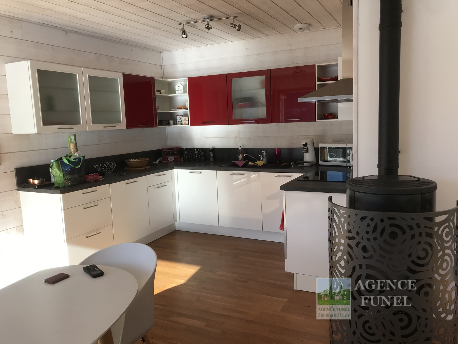 Il se compose d'une entrée avec placards, Salon avec Poêle à bois ouvrant sur Terrasse, Cuisine américaine équipée, 2 Chambres, Salle d'eau avec Wc.